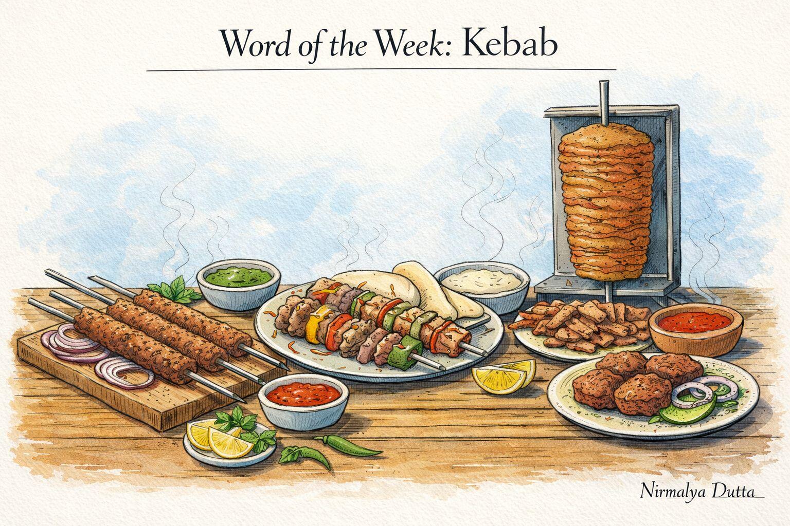 Kebab comes into English from Persian kabāb (کباب), meaning roasted or grilled meat. It entered English in the 17th century, likely through contact with the Ottoman world and through Indo-Persian usage during the Mughal period. Variants of the word exist across languages: Turkish kebap, Arabic kabāb, and the American spelling kabob.