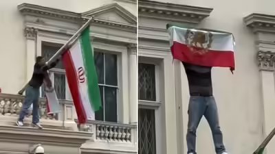 Iran pre-Islamic revolution flag was briefly hoisted on the Iranian embassy in London. A video going viral on social media shows a man climbing up the building as he tears down the Iranian regime flag and replaces it with the pre-1979 flag with a lion and sun during a demonstration on Saturday.Hundreds of other protestors gathered outside the building were also seen waving the pre-Islamic revolution flag, chanting anti-government slogans.The flag stayed in place for several minutes before being removed, news agency AFP reported.Fresh protests also flared across Iran on Friday, in Tehran, Mashhad, Tabriz and the holy city of Qom, chanting slogans against Supreme Leader Ayatollah Ali Khamenei. In Tehran’s Sa’adat Abad district, residents banged pots and pans and blared car horns in a show of defiance, undercutting state media assertions that calm had returned.The demonstrations, described as the biggest since the 2022–23 unrest triggered by Mahsa Amini’s death in custody, began on December 28 amid soaring living costs and the rial’s plunge, and have since shifted into open challenges to Iran’s clerical system.