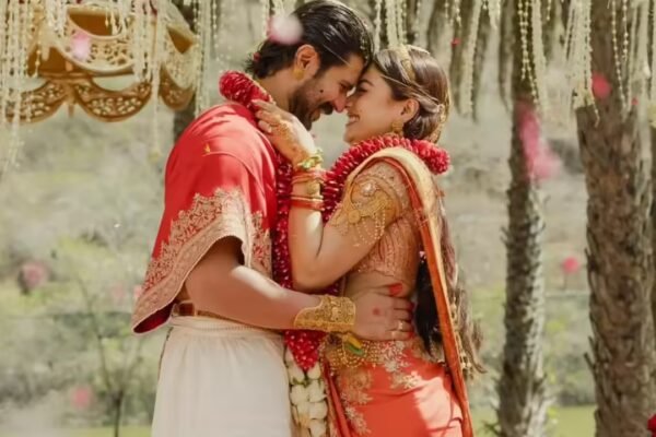 The bride Rashmika wore a rust-red saree rich in antique gold embroidery and temple-inspired motifs. Her layered temple jewellery added a sacred, almost divine presence to the bridal look. The ensemble balanced elegance, tradition and quiet luxury without feeling excessive. Source link