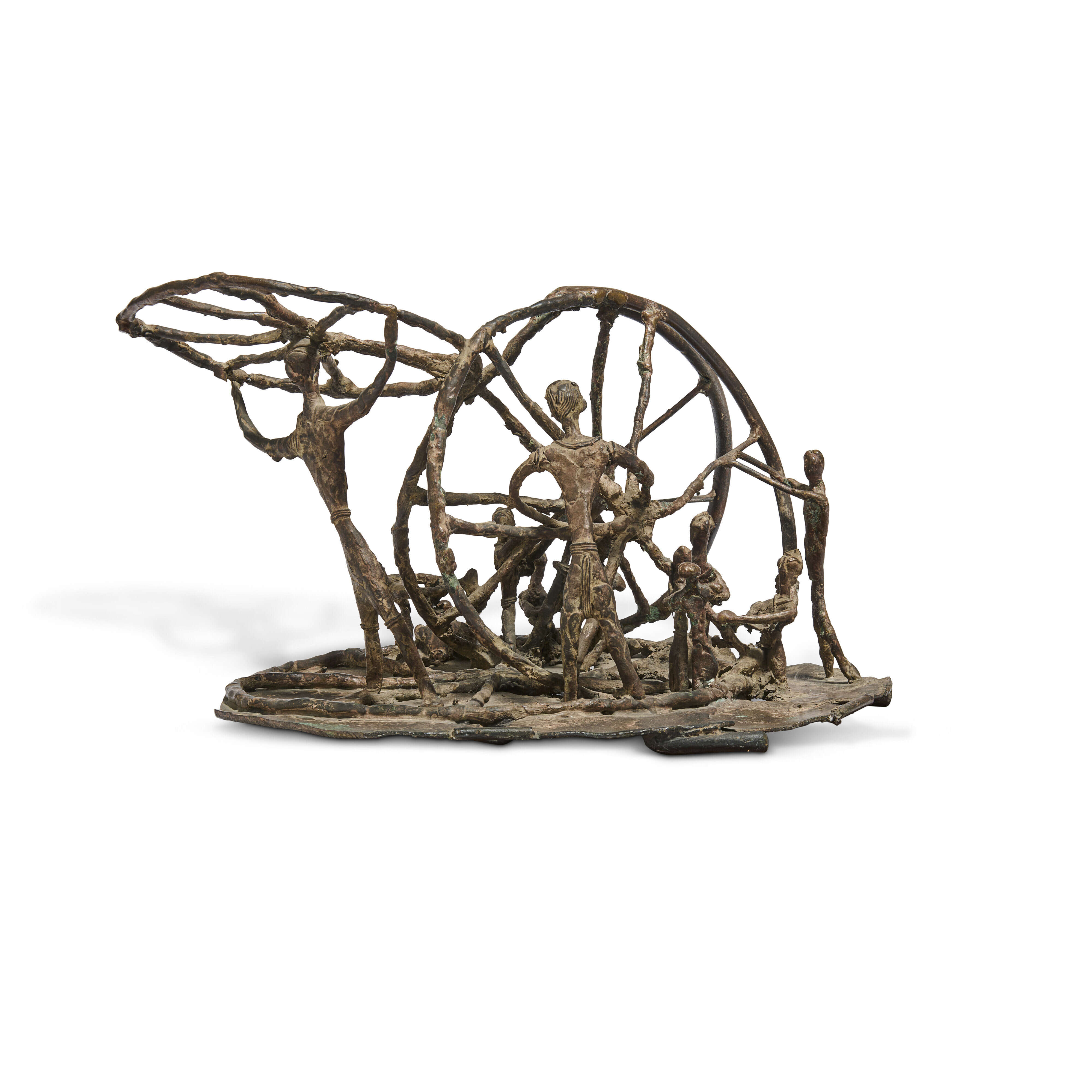 India’s mistress of the bronze world, Meera Mukherjee’s lithe linearity and love for novel compositions that reflect rural rhythms set in a modernist mood is seen in her Untitled (Wheel Builders). Her transition from studying and adapting traditional Dhokra (lost-wax) casting techniques into modernist idioms from everyday subjects she experienced during her time with the tribals is a work that transcends time. Within the supple creation of symbolism, we sense her distinctiveness in creating works of the core of rural rhythms highlighting the strength and influence of labour all over the world, the simplicity and aura of human ethos in movement, and the dignity of man who leads an ordinary life.