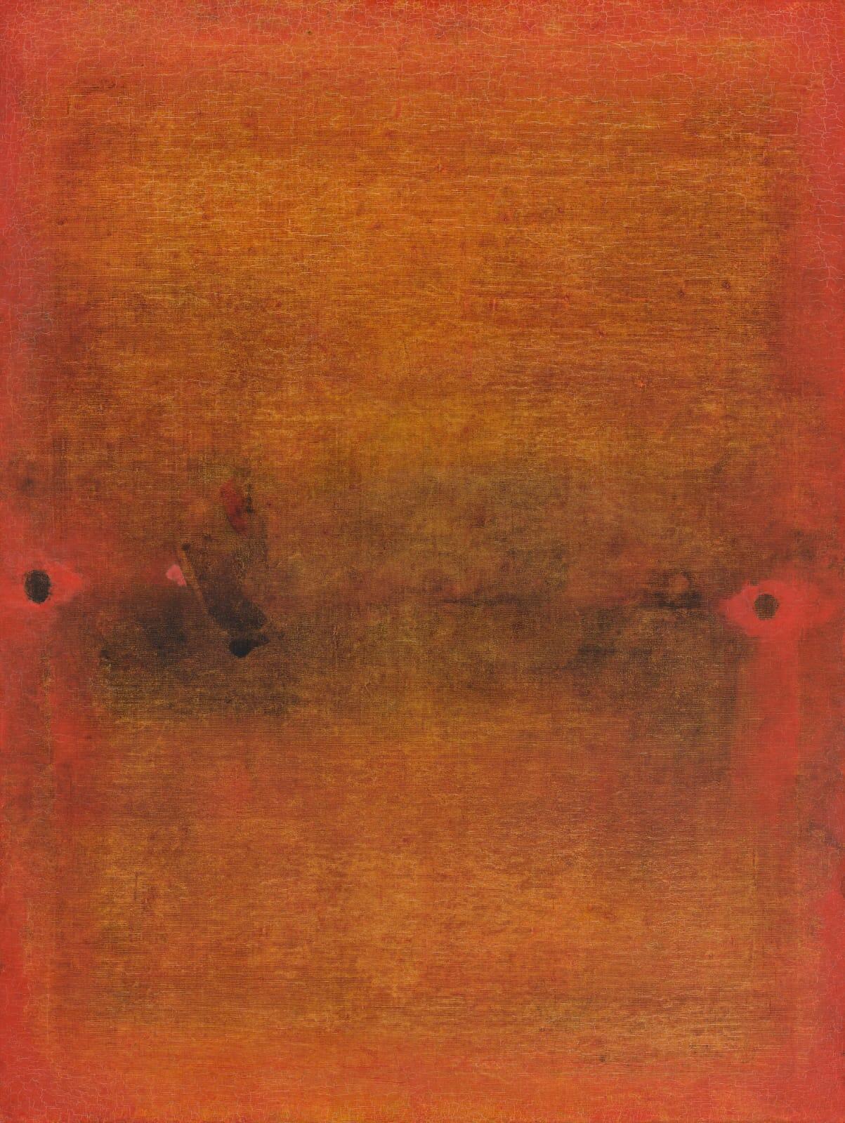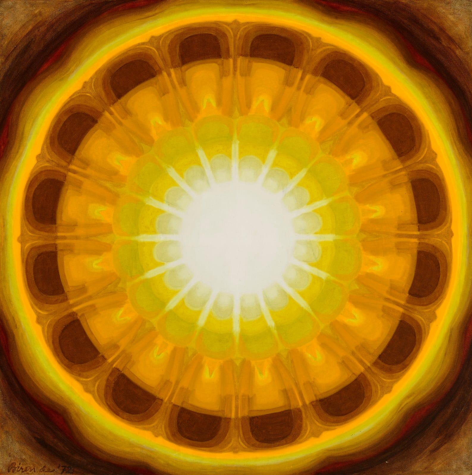 The second abstract master Biren De creates his own index of luminous zones in his  painting 1972 that captures the cosmic echo and relies on the way he was able to weave dimensions of light and colour through a unique process so as to set a meditative mood within and without. For De it wasn’t about crispness of contours; it was about finding a softened aura of shades and shadows to echo paradigms of Purusha Prakriti. The depth came within the singularity of each unearthly petal of consciousness. The beauty of the intensity is held in the reflections that seem like ripples of meditative symbolism in the spaces of silence. This image has an equation that makes us think of the sun and of the mandala, as well as the vortex of intricate layers within the earth’s core.