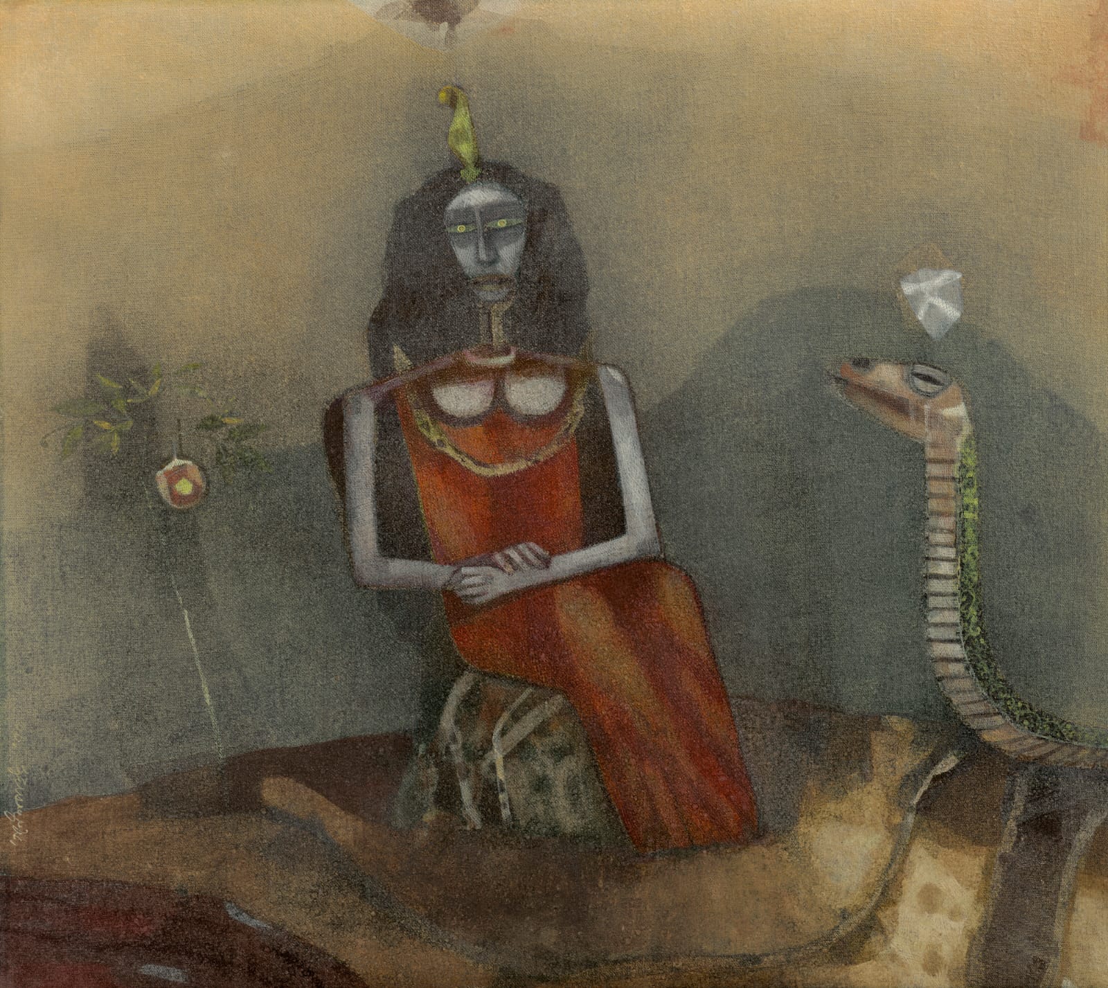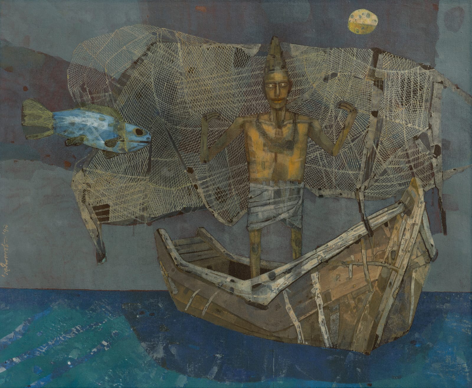 Nishad Avari states that Ganesh Pyne’works from the 1970s are central to Sublime Shadows including The Fisherman. Following two consecutive world-record results in the New York sale on 25 March, the collection features a range of works – from large tempera-on-canvas paintings to smaller sketches. These pieces reveal his singular “poetic surrealism,” drawing on Bengali folklore, mythology, and memory. Pyne’s works are uncommon at auction and attract strong international interest, representing the pinnacle of his carefully cultivated visual language. It is the sombre colours, and the cross hatched layers that add their own fascinating terrain of textural nuances along with a mood of melancholic meanderings of thought.