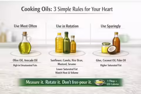 Mustard and peanut oils: Mustard oil can be part of a rotation but should not dominate in high quantities if lipid markers are elevated. Peanut oil is acceptable for occasional high-heat cooking at home with fresh oil.