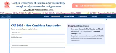 The registration process for CUSAT CAT 2026 started on January 27, 2026. Based on previous years, the last date to apply is likely to be in early March.The entrance exam will be held from May 9 to May 11, 2026. The test will be conducted in computer-based mode at selected exam centres. The university will release the detailed exam timetable for each subject on its official website at a later date.