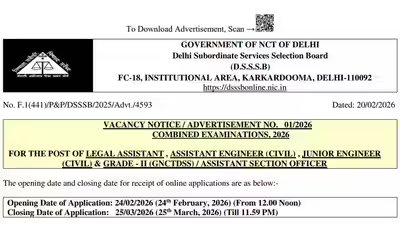The Delhi Subordinate Services Selection Board has published the DSSSB DASS Grade 2 Notification 2026 PDF for 911 posts including DASS Grade-II, Assistant Section Officer, and Legal Assistant. The notification was published on February 20, 2026, on the official website, www.dsssb.delhi.gov.in.The online application process for the DSSSB DASS Grade 2 Recruitment 2026 will start from February 24, 2026, and will continue until March 25, 2026. The application process will only be possible through the official website. The recruitment drive offers Group-B positions under the Government of NCT of Delhi for graduates meeting the prescribed criteria.Vacancy distribution across departmentsA total of 911 posts have been notified under Advertisement No. 01/2026. Of these, 576 vacancies are for Grade-II (GNCTDSS)/Assistant Section Officer in the Services Department. The Junior Engineer (Civil) posts account for 180 vacancies in Delhi Jal Board and 101 in New Delhi Municipal Council.Assistant Engineer (Civil) vacancies include 32 posts in Delhi Jal Board and one post in Delhi Agricultural Marketing Board. The Legal Assistant vacancies are allocated in the following departments: Delhi Pollution Control Committee, Delhi Urban Shelter Improvement Board, Department of Law, Justice, and Legislative Affairs, and Delhi Transport Corporation.The breakup of the posts according to categories is as follows: 365 for UR, 220 for OBC, 140 for SC, 59 for ST, and 127 for EWS, making a total of 911.Eligibility and age criteriaCandidates must hold a graduation degree in Arts, Science, Commerce or Agriculture from a recognised university or institute. The age limit prescribed is 20 to 30 years.For Legal Assistant posts, a degree in Law from a recognised university is mandatory. Experience requirements vary by department. Some jobs need three years of experience at the Bar, and others need one or two years of legal practice or experience in dealing with legal work in a Government Department or PSU. For Delhi Transport Corporation, the candidate needs to be enrolled with the Bar Council and should have knowledge of Hindi.Selection process and application feeThe selection process includes Tier 1 and Tier 2 online exams, Document Verification, and Medical Test. Depending on the job, there may be Skill Test, Endurance Test, Driving Test, or Trade Test. The application fee is Rs. 100 for UR and OBC candidates. Women applicants and candidates belonging to SC, ST, PwBD and Ex-serviceman categories are exempted. Fees must be paid through SBI e-pay only.
