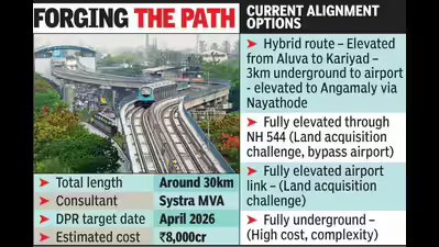 Sources indicate that a “hybrid” corridor — combining elevated and underground stretches — has gained preference for its potential to maximize connectivity and passenger footfall.Under this option, the line would begin as an elevated stretch from Aluva along NH 544 up to Kariyad. A crucial three-km underground section is proposed thereafter to directly link the network to airport, with an underground Metro station planned at the airport. Post-airport, the corridor would revert to an elevated structure, passing through Nayathode and Areekkal before terminating at Karayamparambu in Angamaly town.Final alignment decision, expected once DPR is completed, will determine how effectively Metro integrates airport and northern suburbs into Kochi’s expanding transit grid.The proposed alignment envisions 15 strategic stations to serve as commuter hubs — Thottakkattukara, Kunnumpuram, Parambayam, Nedumbassery, Athani, Kariyad, Airport Railway Station, Airport, Nayathode, Kavarapparambu, Areekkal Jn, LF Hospital, Angamaly Town, Kothakulangara and Karayamparambu.The DPR also explores three other options — a fully elevated route along NH 544 stretch that bypasses the airport entirely, fully elevated airport link and fully underground corridor to airport.Meanwhile, despite preference for Nayathode-Areekkal route, a significant segment of stakeholders is advocating for Metro to stick closer to national highway after airport. This would bring Metro closer to major industrial and transit points, including Telk (Transformers and Electricals Kerala Ltd), Angamaly railway station and municipal bus stand, ensuring a truly integrated multi-modal transport network, they argue.A discussion of possible routes in Airport-Angamaly section was held in Angamaly on Wednesday in which Angamaly MLA Roji M John and municipality chairperson Reetha Paul attended.“Metro authorities presented multiple route options from airport to Angamaly. As per National Metro Rail policy, any alignment should ensure connectivity to airport since the project couldn’t meet the population criteria. They are yet to finalize an alignment, but airport connectivity is a must. They said they will study all options and take a final decision based on technical and economic factors,” John told TOI.