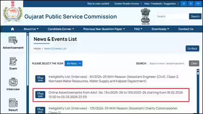 GPSC Recruitment 2026: The Gujarat Public Service Commission (GPSC) has put out a notification for online applications for various Class-1 and Class-2 Engineering vacancies in the Gujarat Maritime Board (GMB). This recruitment exercise, advertised as Nos. 134/2025-26 to 139/2025-26, includes posts for Executive Engineers, Deputy Executive Engineers, and Assistant Engineers in the Civil, Mechanical, and Electrical branches.The online application window will be open from 18 February 2026, 1:00 PM until 05 March 2026, 11:59 PM. The candidates have to submit the applications only via the authentic OJAS portal which could also be reached through the GPSC website Gujarat Public Service Commission.Important Dates