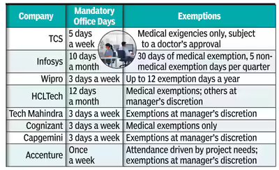 Bengaluru: One size doesn’t fit all in the return-to-office push. Work-from-home, once the defining perk of the pandemic era, is quietly being phased out across India’s IT sector as companies tighten hybrid work norms and make in-office presence the new default.TCS has mandated five days of office attendance and linking compliance to variable pay and career progression. In 2024, TCS rolled out a work-from-office policy that directly links variable pay to attendance compliance. Employees with 85% or higher office attendance are eligible for 100% of the variable pay for the period, subject to organisational decisions. Those with 75–85% compliance receive 75% of the payout, while employees with 60–75% attendance are eligible for 50%. Staff with less than 60% compliance are not eligible for any performance bonus. Other IT majors, while stopping short of a full return, have introduced their own checks and balances to enforce hybrid work.Infosys mandates a minimum of 10 in-office days each month, with 30 days of medical exemption built into the policy. Employees can also avail five non-medical exemption days per quarter.Wipro now requires employees to work from the office at least three days a week, allowing up to 12 exemption days annually for those unable to meet the requirement. Accenture asks employees to come in once a week. In practice, attendance is often shaped by team-level expectations and managerial discretion rather than policy alone.The broader shift signals a move away from one-size-fits-all work models toward more tightly monitored hybrid frameworks. Work-from-home, once used as a key talent attraction tool, is losing relevance in a market marked by slowing revenue growth, margin pressures, and cautious client spending.“HR norms are moving toward role-based and outcome-based hybrid models,” said Phil Fersht, CEO and chief analyst at US-based IT advisory HFS Research. “Early-career staff, client-facing roles, and teams handling sensitive data will see tighter in-office norms, while senior or highly specialised roles will retain greater flexibility. AI and automation are also making work more collaborative and iterative, increasing the value of in-person interaction at certain stages.”Pareekh Jain, CEO and lead analyst at Pareekh Consulting, said companies are tightening norms because concerns around attrition and talent attraction have eased. “There will still be flexibility for mental and physical health needs, but that will vary by company. Some will mandate two or three days a week, others 10–15 days a month,” he said.