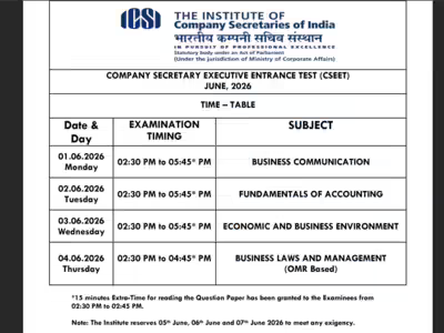 ICSI CSEET June timetable 2026: Institute of Company Secretaries of India (ICSI) has released the exam dates for the Company Secretary Executive Entrance Test (CSEET) 2026. The exams will be held in June 2026.The ICSI CSEET examination will be conducted over four days. It will start on June 1 and end on June 4. All papers will be held in the afternoon session. Candidates can now plan their preparation accordingly.