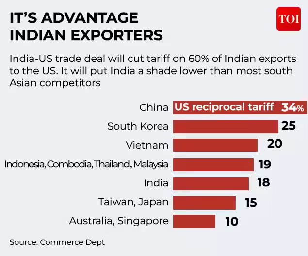 With an 18% tariff, India has managed to secure a deal which places its duty rate lower than its neighbouring countries and competitors. Some of the main countries which compete with India’s labour-intensive sectors in the global markets are: Vietnam (20%), Malaysia (19%, Bangladesh (20%), Cambodia and Thailand (19%), China (34%). India has also got a lower rate than Pakistan which gets tariffed at 19%.