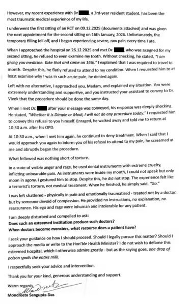 A few days later, I returned to narrate the incident to the dean. The same dean who had once been warm and gracious, especially when she learned of my media connection and requested me to write about her after she won the title of Mrs India, now refused to meet me once she knew I had come with a complaint. Another senior doctor heard my account but initially defended both the concerned doctor and the institution strongly. When I expressed my fear that a doctor who loses control in anger could endanger lives, he summoned the concerned doctor.