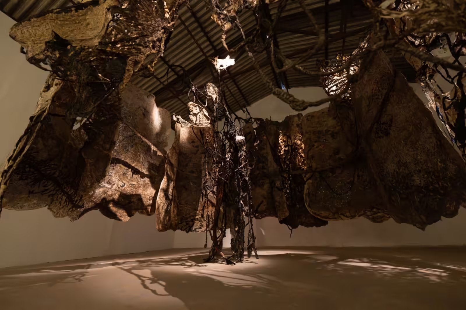 Monumental and contemplative is Shelter for the Time Being, an enchanting open ended organic form of overlapping, bustling, rough-hewn fragments, hanging loosely.