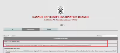 As per the official notice, the schedule covers First Semester BA, BCom and BBA Degree (Private Registration) Supplementary examinations. These exams are meant for students admitted between 2020 and 2023 who have pending papers.The examinations are part of the November 2025 session. Candidates who had applied for supplementary appearance can now check the date-wise timetable. The university has clarified that only eligible candidates will be permitted to attend the exams.Students are advised to verify their subject codes and examination centres mentioned in the detailed schedule.Students can also check Kannur University results for UG and PG programmes from the official website. The direct link to check multiple results is provided below.Direct link to check Kannur University result 2026