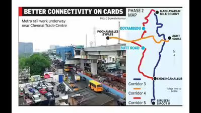 “We are advancing the deadline for this stretch as it will provide a critical link to Phase-1 lines at Koyambedu. The original target was June 2027, but we are trying to get the line ready within six months,” a metro rail official said.In Feb, the first Phase-2 line, the 14.5 km Poonamallee Bypass–Vadapalani stretch, is expected to begin passenger operations. The Koyambedu–Butt Road section will link with the Vadapalani–Poonamallee line at four double-decker stations — Alwarthirunagar, Valasaravakkam, Karambakkam and Alapakkam. A skywalk at Koyambedu will connect this Phase-2 section with the Phase-1 stations, improving access to the existing metro network. Once operational, the line is expected to benefit office-goers travelling to the Porur IT corridor, visitors to the Chennai Trade Centre, and traders and shoppers heading to the Koyambedu wholesale market.“I invariably get stuck in peak-hour traffic on Mount–Poonamallee Road. Taking the metro could reduce my travel time, provided there is good last-mile connectivity,” said N Santosh, a techie from Ramapuram.However, advancing the project by one year is a challenge. Officials said civil work is yet to begin in a few small stretches along Butt Road, where narrow roads and dense development make construction difficult without disrupting traffic.“We did not lay foundations for five piers on Butt Road due to traffic constraints. We may even complete the balanced cantilever work over Kathipara before that, possibly by April. We are trying to get the line ready as early as possible,” the official said.Earlier plans to open the stretch from Koyambedu to Alandur to directly link Phase-2 with Phase-1 were revised, as construction over Kathipara flyover could be carried out only during the night to avoid traffic disruption.
