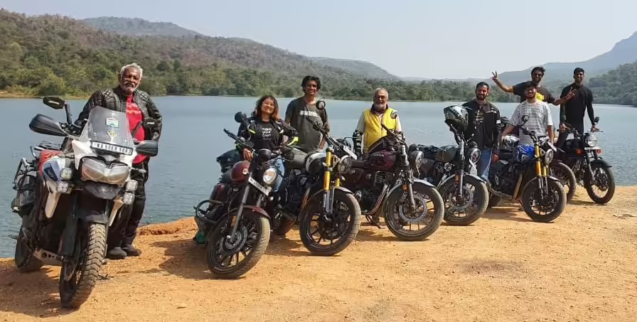 We started a little later than the usual 6 am, with a contingent of eight riders from Prestige Monte Carlo Apartments. The bikes (in descending order of engine capacity) included a Triumph 1200 ridden by Mr Ganapathy (a gentleman of leisure); Himalayan 411 (YG); two Triumph 400s ridden by Mehul (an undergraduate student and Mr Ganapathy’s son) and Anikaait (a young engineer); two Honda CBR 350 H’ness ridden by Aditya (manager in an ITES company) and yours faithfully (retired but not tired); one Bullet 350 ridden by Mehul’s friend, whose name eludes my memory; and Trina (communication designer by day and rock singer by night) on her Jawa 42. Incidentally, I’m the adopted Dadu (grandpa) for Anikaait and Trina—a role I have embraced with pride!