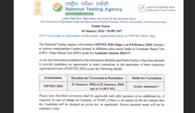 NIFTEE application form 2026: The National Testing Agency (NTA) will conduct NIFTEE 2026 Stage 1 on February 8, 2026 (Sunday) for admissions to the Academic Session 2026–27. The entrance examination will be held at multiple centres across India in both Computer-Based Test (CBT) and Paper-Based Test (PBT) modes.As per official information, the Stage 1 test will be organised in designated cities nationwide. Candidates will appear for the exam either in CBT or PBT mode, depending on the options selected during registration and the availability at examination centres.In line with details mentioned in the Information Bulletin and Public Notice, NTA has also announced a one-time opportunity for application form corrections. Candidates who have already submitted their NIFTEE-2026 application forms will be allowed to edit specific details.The correction window will remain open from January 21 to January 22, 2026, up to 11:50 pm. Previously, it was to open on January 20, 2026. Only the fields specified by NTA, as outlined in the official annexure, will be available for correction. No further chances will be provided once the window closes.