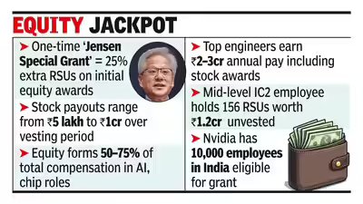 BENGALURU: A majority of Nvidia’s 10,000 India-based employees have received CEO Jensen Huang’s one-time special stock grant, with payouts ranging from over Rs 5 lakh to as much as Rs 1 crore over the grant period, according to data from US-based salary tracker 6figr. The “Jensen Special Grant,” rolled out in 2024, is a one-time stock award that provides employees an additional 25% of their initial restricted stock units (RSUs). The grant vests over four years, with values determined in local currency and converted into US dollars at an exchange rate of Rs 82.9 per dollar. RSUs were allocated based on an average Nvidia share price of $898.2 and will vest over four years, starting with 6.25% on Sept 18, 2024, followed by equal quarterly instalments, ending in 2028. TOI has reviewed a copy of the compensation letter.In one instance, a mid-level employee in a solutions architecture role (IC2) received eight additional RSUs under the special grant, valued at about Rs 5.3 lakh at the time of allocation. This was in addition to an annual equity grant of 29 RSUs worth roughly Rs 21.5 lakh. The document further shows that the employee’s total unvested equity stood at 156 RSUs, valued at over Rs 1.2 crore as of April last year, underlining the growing importance of stock awards as a retention strategy. When TOI reached out to Nvidia regarding the special grant and broader pay structure, the company’s spokesperson said, “As a policy, we don’t share or comment on employee compensation details.”India is witnessing a fresh wave of dollar millionaires, driven by equity-led compensation at global semiconductor and AI firms. At Nvidia India, stock-based pay can account for 50% to 75% of total compensation, making it the primary driver of long-term wealth creation. For mid- to senior-level roles, particularly in chip design and AI engineering, equity grants often far exceed fixed salaries. Deep technical expertise, especially in hardware and AI, commands a significant premium over managerial tracks, with top engineers earning Rs 2-3 crore in annual compensation, according to 6figr. At the upper end, IC6 engineers form the highest-paid cohort, with software engineers at this level earning an average of about Rs 1.8 crore, and top earners approaching Rs 1.9 crore. “What we’re seeing at Nvidia is the emergence of a new compensation philosophy for the AI economy,” said Yashveer Rana, co-founder of 6figr.com. “Equity is replacing cash as the dominant lever, tying individuals directly to the upside they help create. Those closest to the models, the chips, and the core technology are not just employees, but stakeholders in the company’s future.” He added that 6figr’s insights are based on verified data from employee-submitted documents and payroll records. Akhilesh Tuteja, partner and national leader (clients and markets) at KPMG in India, said, “In emerging deep-tech areas like semiconductors and AI, the difference in outcomes between a ‘good’ engineer and a ‘great’ one can be significant. In such roles, equity is no longer just a retention tool; it has become the primary wealth creator. As global firms deepen their India footprint, stock-linked compensation is increasingly aligning Indian talent directly with global value creation.” At the entry and early-career stages, compensation remains relatively modest. IC1 roles (0-3 years) typically earn Rs 10-22 lakh, while IC2 roles (1-8 years) range from Rs 23-32 lakh. As professionals move into mid-level IC3 roles (4-8 years), pay rises to around Rs 27-51 lakh, with a much wider spread. 6figr’s data showed that the 75th percentile reaches about Rs 55 lakh, while the 95th percentile climbs to nearly Rs 85 lakh, reflecting increasing divergence based on skill and performance.