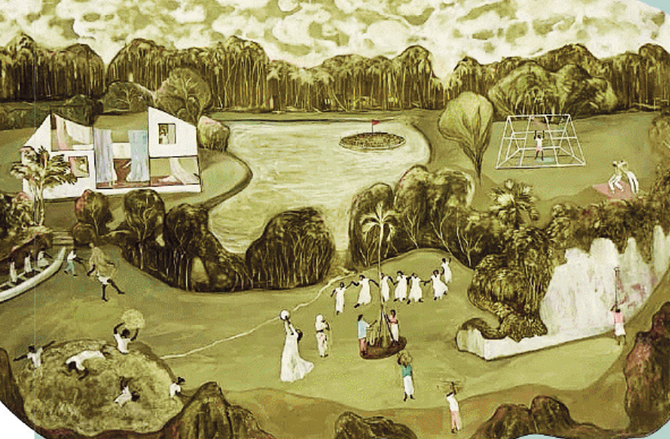 The resulting works are expansive compositions that evoke dense landscapes without fully depicting them. Rooted in the sensory world of rural Malabar, his areca plantations hover between landscape and dreamscape. In the gaps between vertical columns of trees, apparitions of animals and birds surface and recede as if caught between presence and disappearance. Notably, human figures are absent. For Shajith, this is deliberate. “It is viewers who stand in front of these large canvases who complete the picture.” The viewer becomes a participant, implicated in the fragile worlds the paintings evoke.