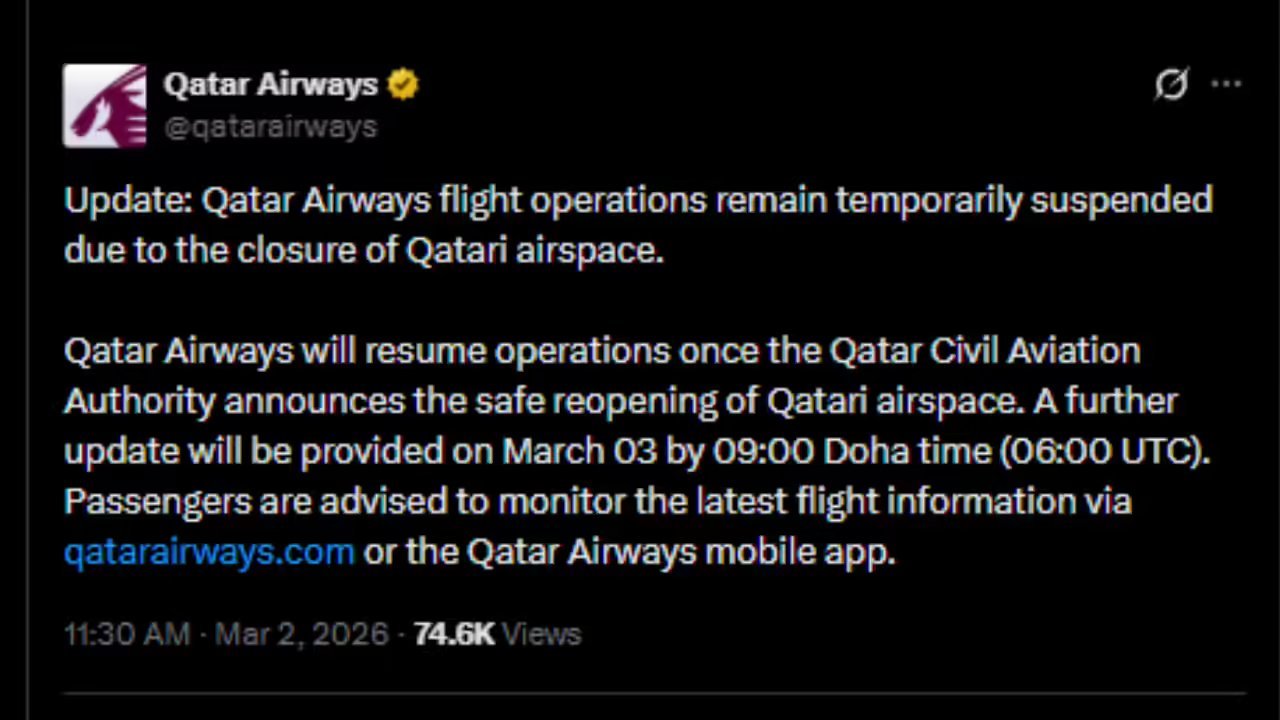The airline shared the same on X, and added “ Qatar Airways will resume operations once the Qatar Civil Aviation Authority announces the safe reopening of Qatari airspace. A further update will be provided on March 03 by 09:00 Doha time (06:00 UTC). Passengers are advised to monitor the latest flight information via qatarairways.com or the Qatar Airways mobile app.”