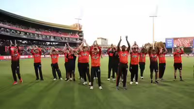 Sunrisers’ chase once again revolved around Quinton de Kock (56 off 49 balls, 6×4, 2×6), with the in-form opener sharing a 109-run partnership for the second wicket with Matthew Breetzke (66 off 55 balls, 8×4).Both departed with victory in sight, creating tension around the ground, but Jordan Hermann held his nerve to hit the winning runs off the penultimate ball of the match and send St George’s Park into seventh heaven.