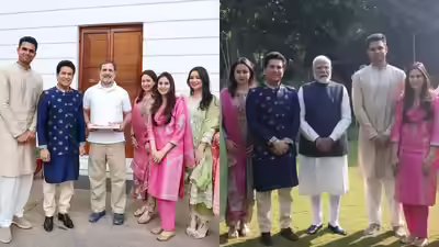 NEW DELHI: Sachin Tendulkar on Tuesday met senior political leaders to invite them to the wedding of his son Arjun Tendulkar and Saaniya Chandok. The legendary cricketer met Rahul Gandhi in New Delhi along with his family and personally extended the invitation.Sharing the moment on social media, Tendulkar wrote, “Our family had the opportunity to meet Shri @RahulGandhi ji and invite him to Arjun-Saaniya’s wedding.”
