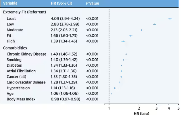 In 2022, Kokkinos et al. published a landmark observational study in the Journal of the American College of Cardiology that evaluated cardiorespiratory fitness and all-cause mortality in over 750,000 U.S. veterans. The study included adults aged 30 to 95 with a median follow-up of 10 years. It was also notable for its diversity, including large numbers of women, African Americans, and Hispanics. Participants completed a treadmill test to determine fitness levels and were then tracked over time. The results were stunning.