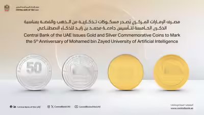 The Central Bank of the UAE has issued a limited set of gold and silver commemorative coins to mark five years since the launch of Mohamed bin Zayed University of Artificial Intelligence, recognising the university’s growth and achievements since it welcomed its first students in 2020.The release coincides with the university’s fifth-anniversary celebrations, covering its work and impact from 2020 to 2025. The coins have been delivered directly to the university and will not be sold through the central bank or MBZUAI.